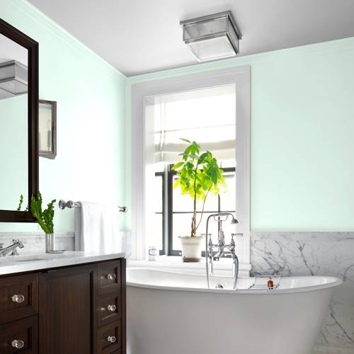 Ce somptueux vert brumeux est magnifique sur un mur de chambre à coucher. Il s’harmonise très bien à des meubles de cerisier foncé.